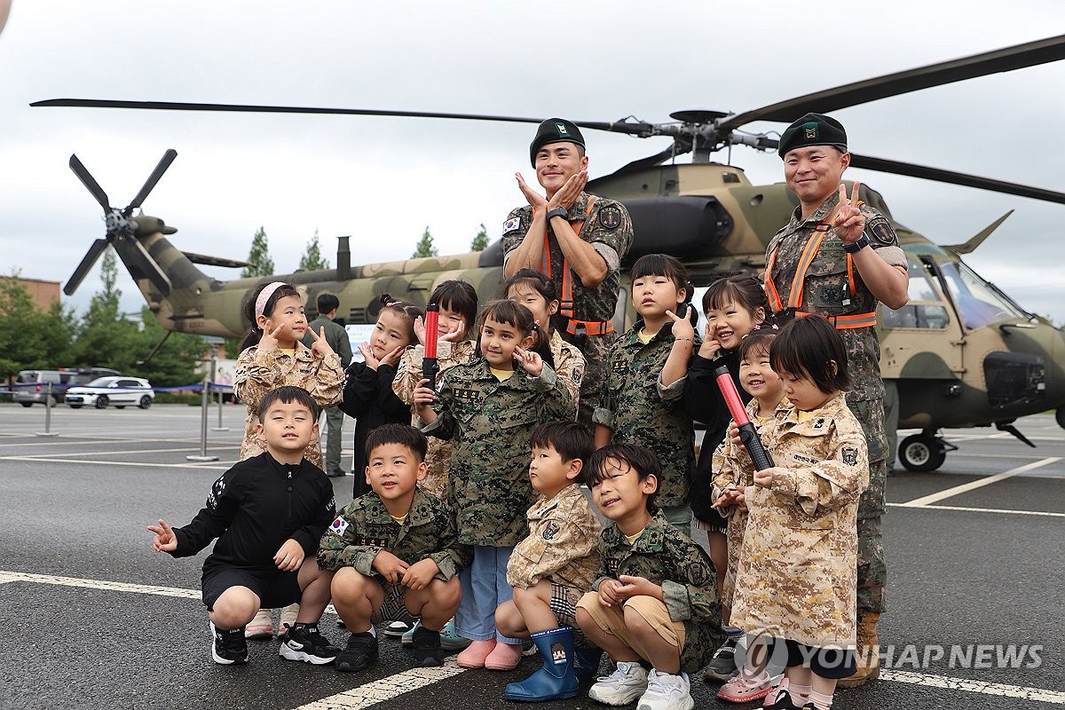 (논산=연합뉴스) 25일 충남 논산시 육군훈련소에서 열린 '2025년 민관군 화합 페스티벌'에 참석한 어린이들이 수리온 헬기를 견학하고 있다. 2025.6.25 [육군훈련소 제공. 재판매 및 DB 금지] coolee@yna.co.kr