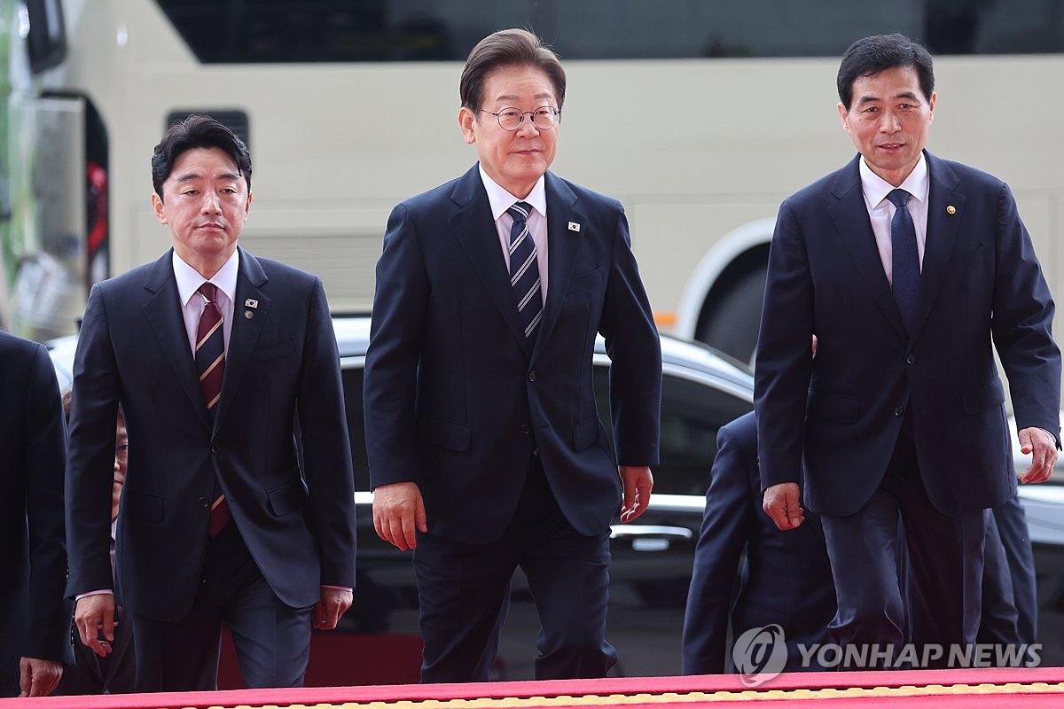 (서울=연합뉴스) 김주성 기자 = 이재명 대통령이 첫 국회 시정연설을 하기 위해 26일 서울 여의도 국회에 도착하고 있다. 왼쪽은 강훈식 대통령비서실장, 오른쪽은 김민기 국회사무총장. 2025.6.26 utzza@yna.co.kr