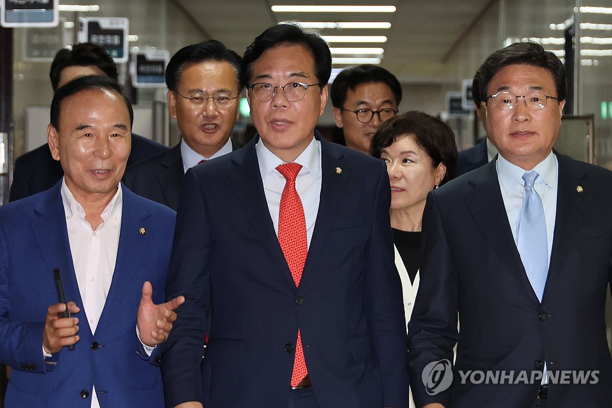 국민의힘 송언석 비상대책위원장 겸 원내대표와 박덕흠, 김대식 의원 등 비대위원들이 7월 1일 서울 여의도 국회에서 열린 비대위 첫 회의에 참석하고 있다. [연합뉴스 자료사진]