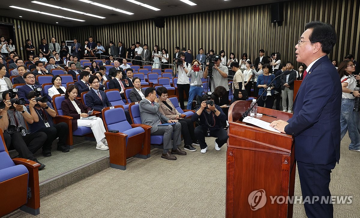 (서울=연합뉴스) 김주형 기자 = 국민의힘 송언석 비상대책위원장 겸 원내대표가 3일 국회에서 열린 의원총회에서 발언하고 있다. 2025.7.3 kjhpress@yna.co.kr