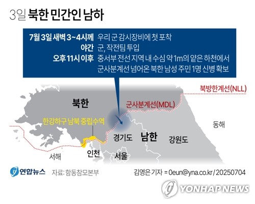 이 남성은 3일 새벽 3∼4시께 우리 군 감시장비에 처음 포착됐다. 중서부 전선 지역 중 수심 1m 정도의 얕은 하천에서 발견됐다.