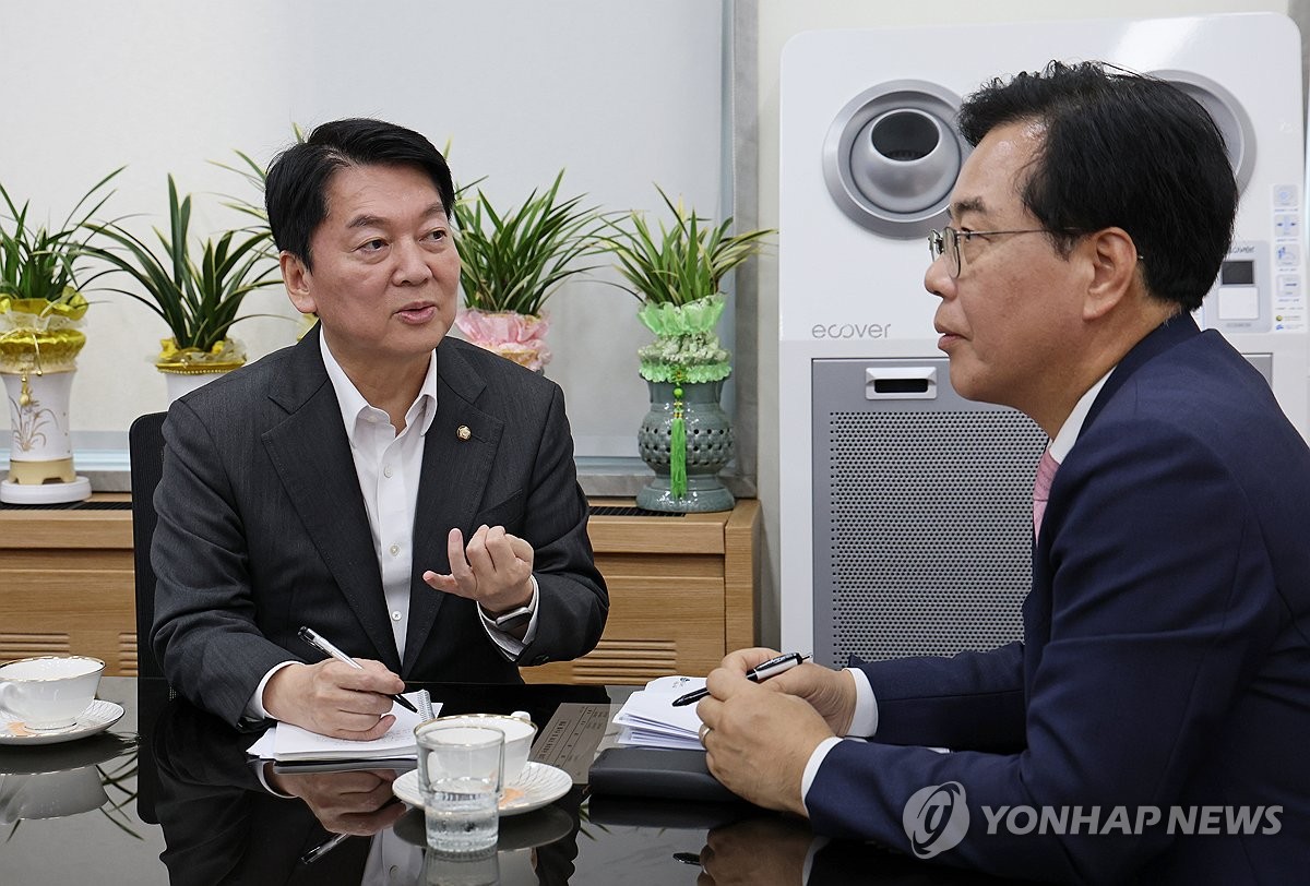 (서울=연합뉴스) 박동주 기자 = 국민의힘 송언석 비상대책위원장 겸 원내대표(오른쪽)와 국민의힘 혁신위원장으로 내정된 안철수 의원이 지난 2일 오후 국회 본청 원내 대표실에서 만나 대화하고 있다. 2025.7.2 [공동취재] pdj6635@yna.co.kr