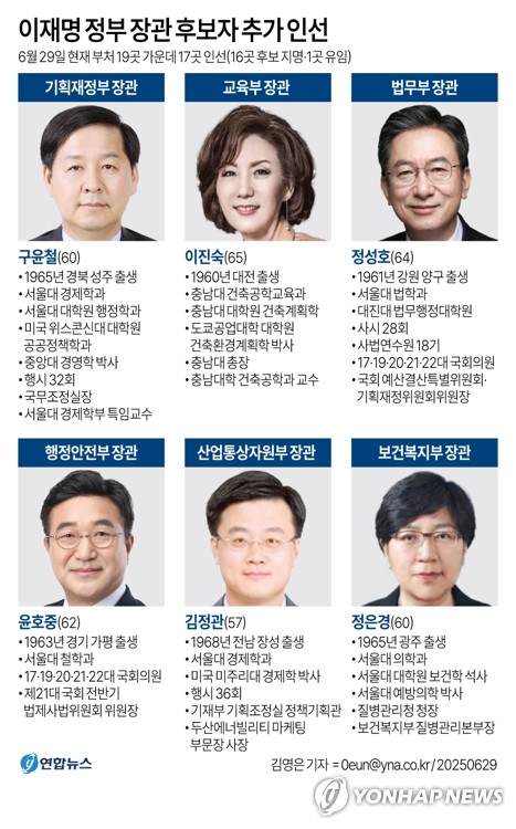 인사청문회를 앞둔 17명의 장관 후보자 가운데 안규백(국방), 윤호중(행정안전), 정동영(통일), 정성호(법무), 김성환(환경), 전재수(해양수산), 강선우(여성가족) 등 후보자 7명이 민주당 현직 의원이다.