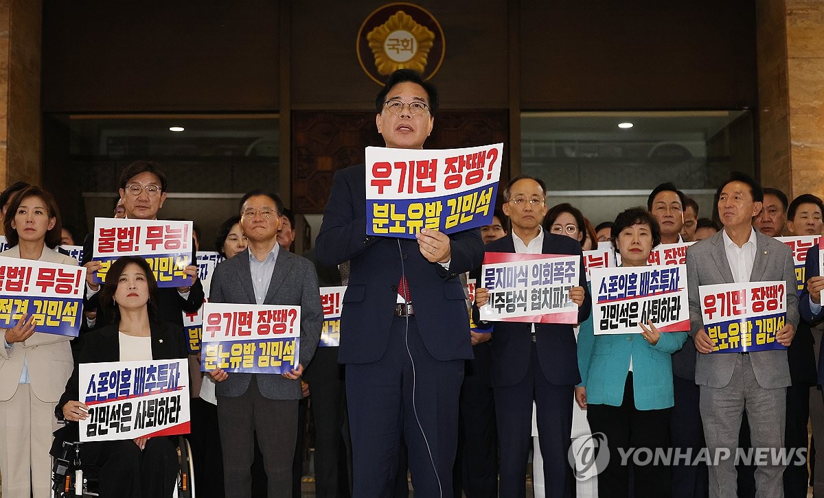(서울=연합뉴스) 김주형 기자 = 국민의힘 송언석 비상대책위원장 겸 원내대표와 의원들이 본회의가 열리고 있는 지난 3일 서울 여의도 국회 로텐더홀에서 김민석 국무총리 후보자 임명동의안 등을 규탄하고 있다. 2025.7.3 kjhpress@yna.co.kr