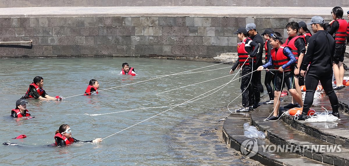 (서귀포=연합뉴스) 김호천 기자 = 8일 오전 제주 서귀포시 법환어촌계 해녀체험장에서 강정초 학생들이 해군 기동함대사령부 해난구조대(SSU) 대원과 해녀들에게 평상복 차림의 착의영 생존수영을 배우고 있다. 2025.7.8 khc@yna.co.kr