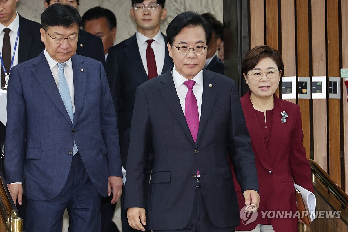 (서울=연합뉴스) 김주성 기자 = 국민의힘 송언석 비대위원장 겸 원내대표와 김정재 정책위의장(오른쪽), 정점식 사무총장(왼쪽)이 8일 서울 여의도 국회에서 열린 원내대책회의에 참석하고 있다. 2025.7.8 utzza@yna.co.kr