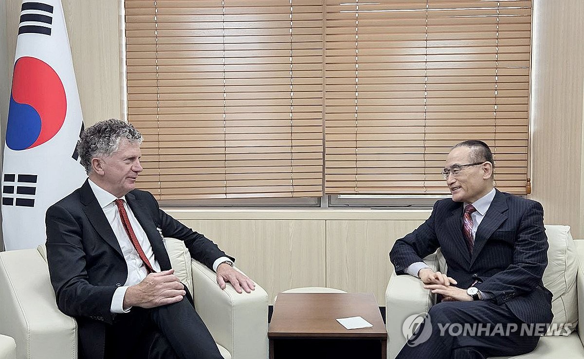(서울=연합뉴스) 위성락 국가안보실장이 15일 서울 용산 대통령실 청사에서 조너선 파월 영국 국가안보보좌관과 면담하고 있다. 2025.7.15 [대통령실 제공. 재판매 및 DB 금지] photo@yna.co.kr