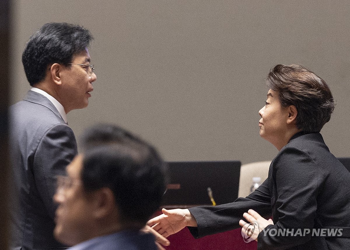 (서울=연합뉴스) 황광모 기자 = 국민의힘 송언석 비상대책위원장 겸 원내대표(왼쪽)과 윤희숙 혁신위원장이 23일 국회 본회의 직후 다시 열린 국민의힘 의원총회에서 만나 악수하고 있다. 2025.7.23 hkmpooh@yna.co.kr