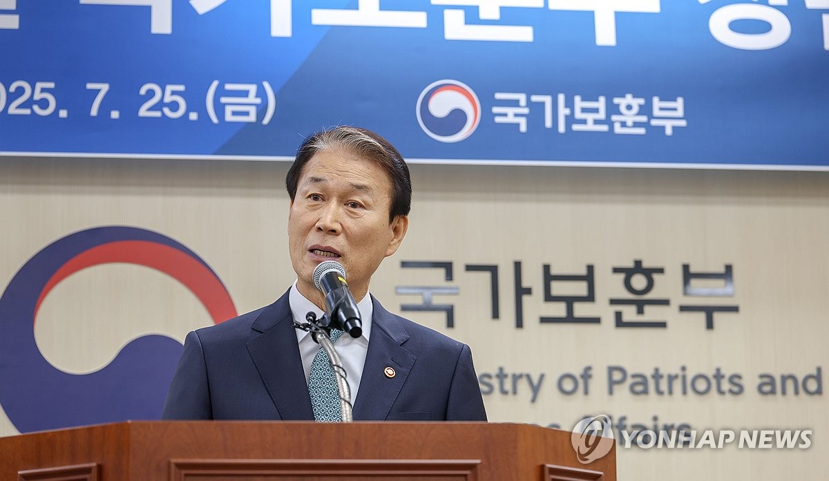 (서울=연합뉴스) 권오을 신임 국가보훈부 장관이 25일 정부세종청사에서 열린 취임식에서 취임사를 하고 있다. 2025.7.25 [국가보훈부 제공. 재판매 및 DB 금지] photo@yna.co.kr