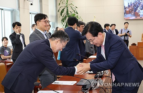 (서울=연합뉴스) 박동주 기자 = 2일 서울 여의도 국회에서 열린 기획재정위원회 전체회의에서 정성호 법무부 장관 후보자(왼쪽)가 송언석 위원장과 인사하고 있다. 2025.7.2
