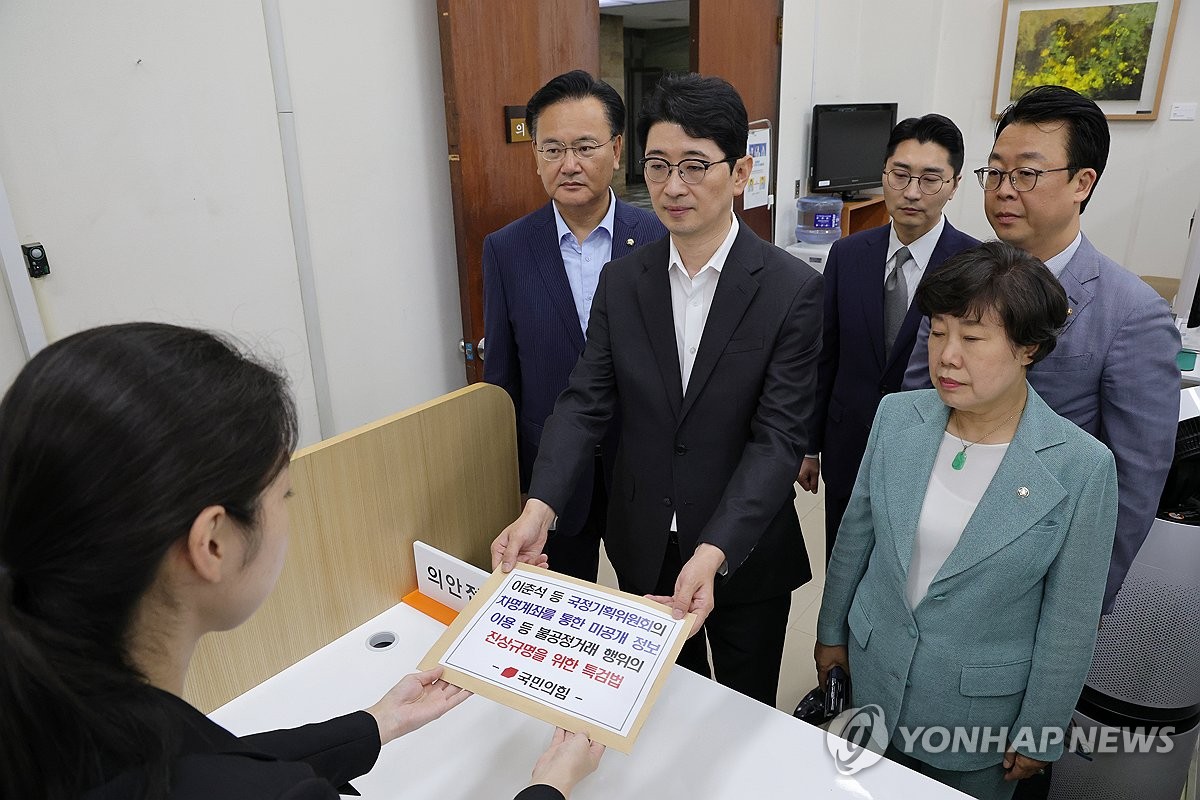 (서울=연합뉴스) 박동주 기자 = 국민의힘 주진우 의원 등 법사위원들이 7일 서울 여의도 국회 의안과에서 '이춘석 등 국정기획위원회의 차명계좌를 통한 미공개 정보 이용 등 불공정거래 행위의 진상규명을 위한 특검법'을 제출하고 있다. 2025.8.7 [공동취재] pdj6635@yna.co.kr