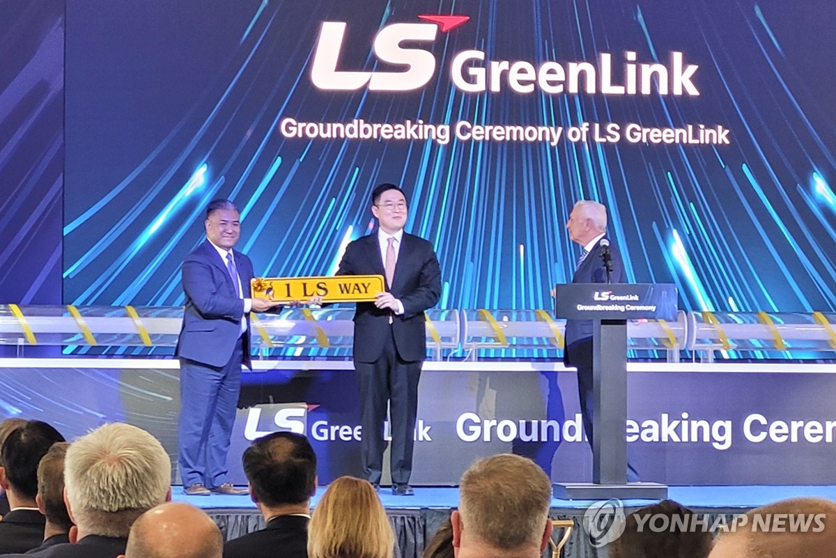 (체서피크[미국 버지니아주]=연합뉴스) 김동현 특파원 = LS전선의 자회사 LS그린링크가 28일(현지시간) 버지니아주 체서피크시에서 해저케이블 제조 공장 착공식을 개최했다. 구본규 LS전선 대표이사가 릭 웨스트 체서피크시 시장(오른쪽)으로부터 받은 'LS 1번가' 도로 표지판을 들고 있다. 2025.4.28 bluekey@yna.co.kr