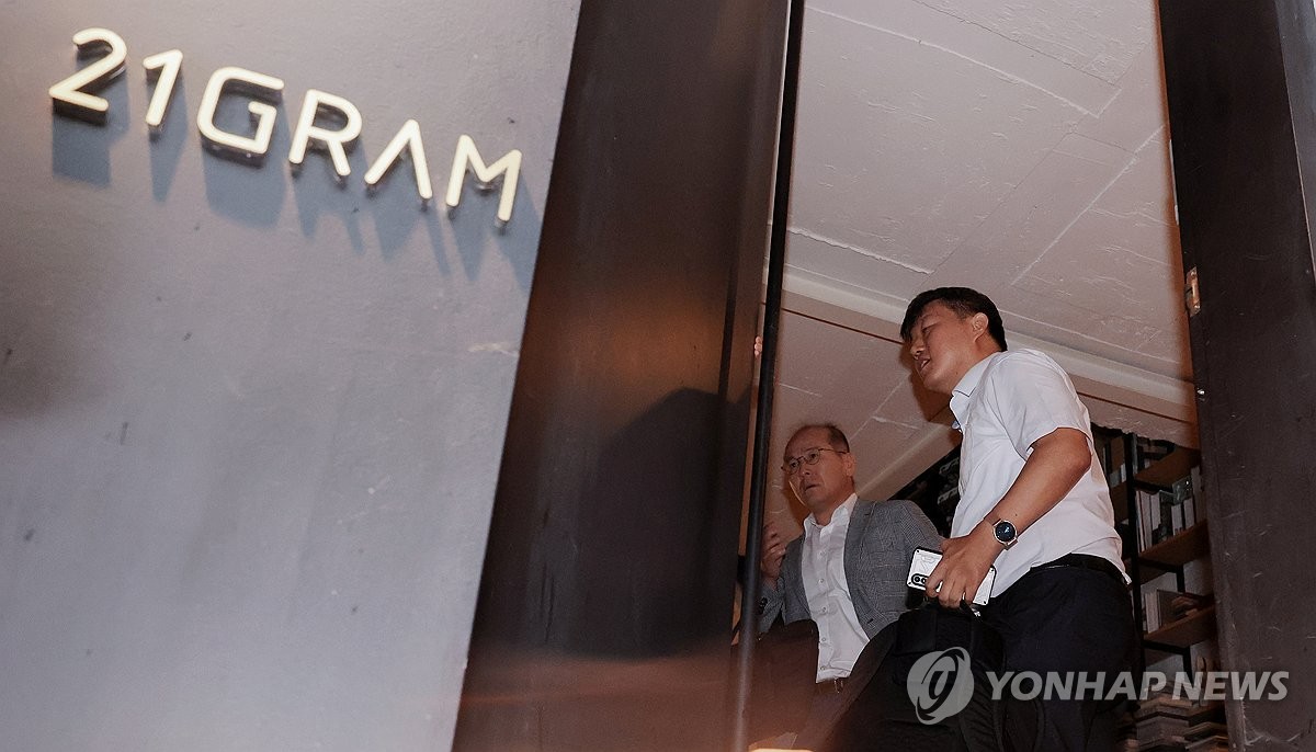 (서울=연합뉴스) 임화영 기자 = 김건희 여사의 각종 의혹을 수사하는 민중기 특별검사팀 수사관들이 13일 서울 성동구에 위치한 인테리어 업체 '21그램' 압수수색을 위해 건물로 들어가고 있다.