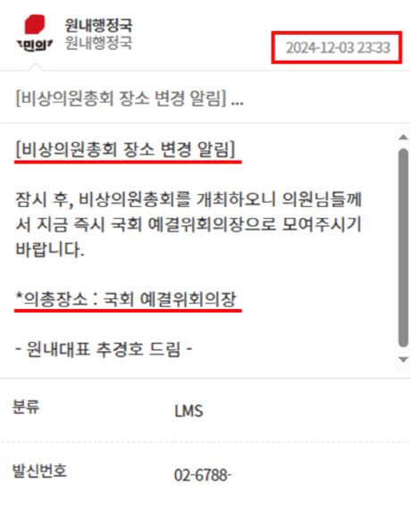 이어 "통화를 마친 후 10분도 채 지나지 않은 23시 33분경 저는 의원총회 장소를 '국민의힘 당사'에서 '국회'로 변경해 공지했다"고 설명했다.