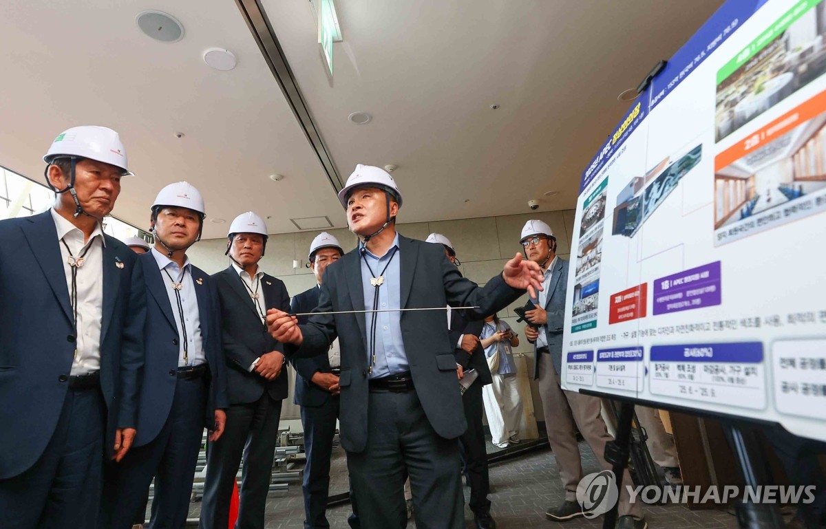 (경주=연합뉴스) 서대연 기자 = 더불어민주당 정청래 대표가 19일 경북 경주시 경주화백컨벤션센터(HICO)에 조성 중인 아시아태평양경제협력체(APEC) 정상회의장을 찾아 관계자의 설명을 듣고 있다. 2025.8.19 dwise@yna.co.kr