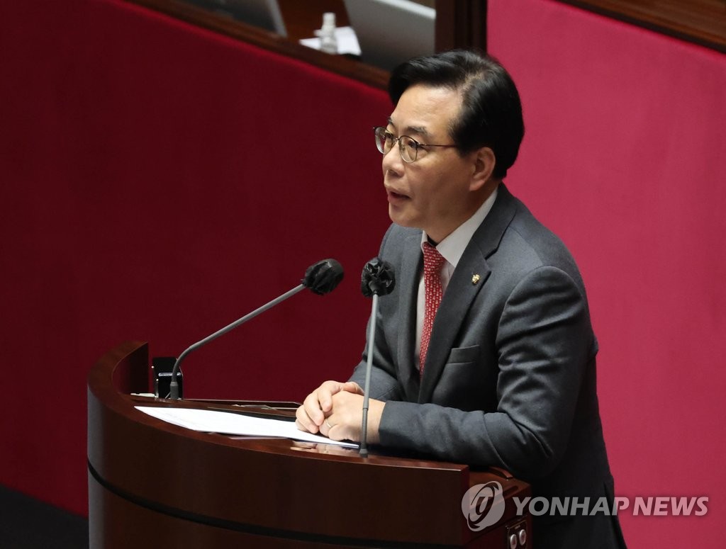 (서울=연합뉴스) 백승렬 기자 = 국민의힘 송언석 원내수석부대표가 8일 오후 국회에서 열린 본회의에서 행정안전부장관(이상민) 탄핵소추안의 법제사법위원회로의 회부 동의 건에 관해 제안설명을 하고 있다. 2023.2.8 srbaek@yna.co.kr