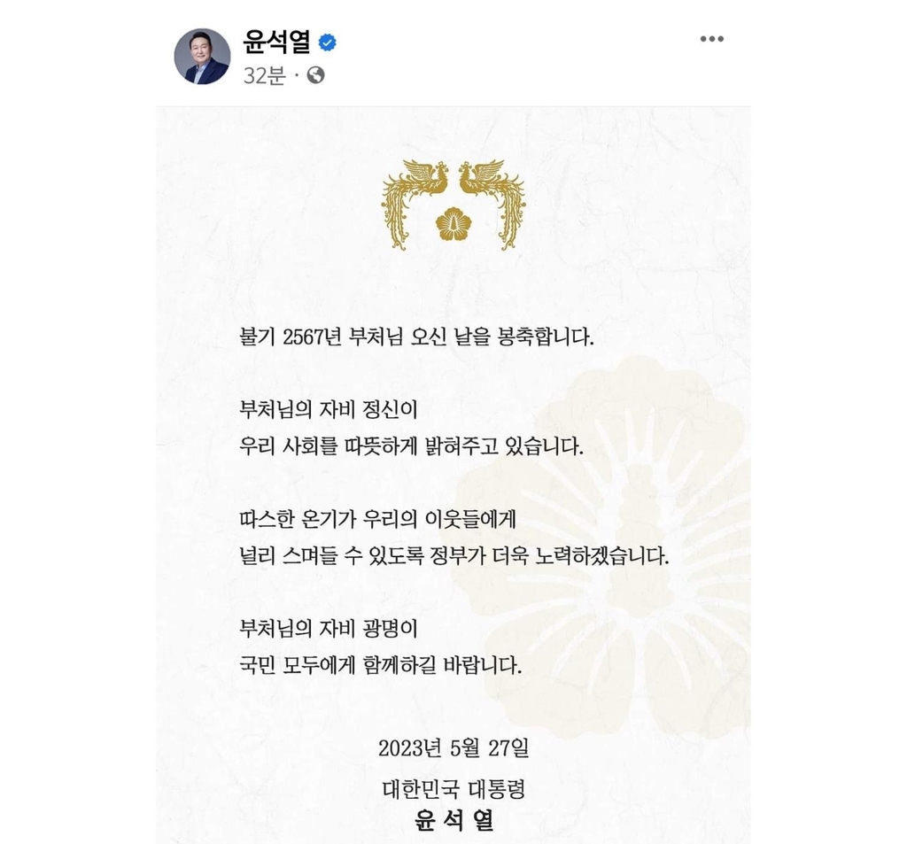윤 대통령은 이날 페이스북에 올린 축전 형식의 기념 메시지에서 "불기 2567년 부처님 오신 날을 봉축한다"며 이같이 적었다.