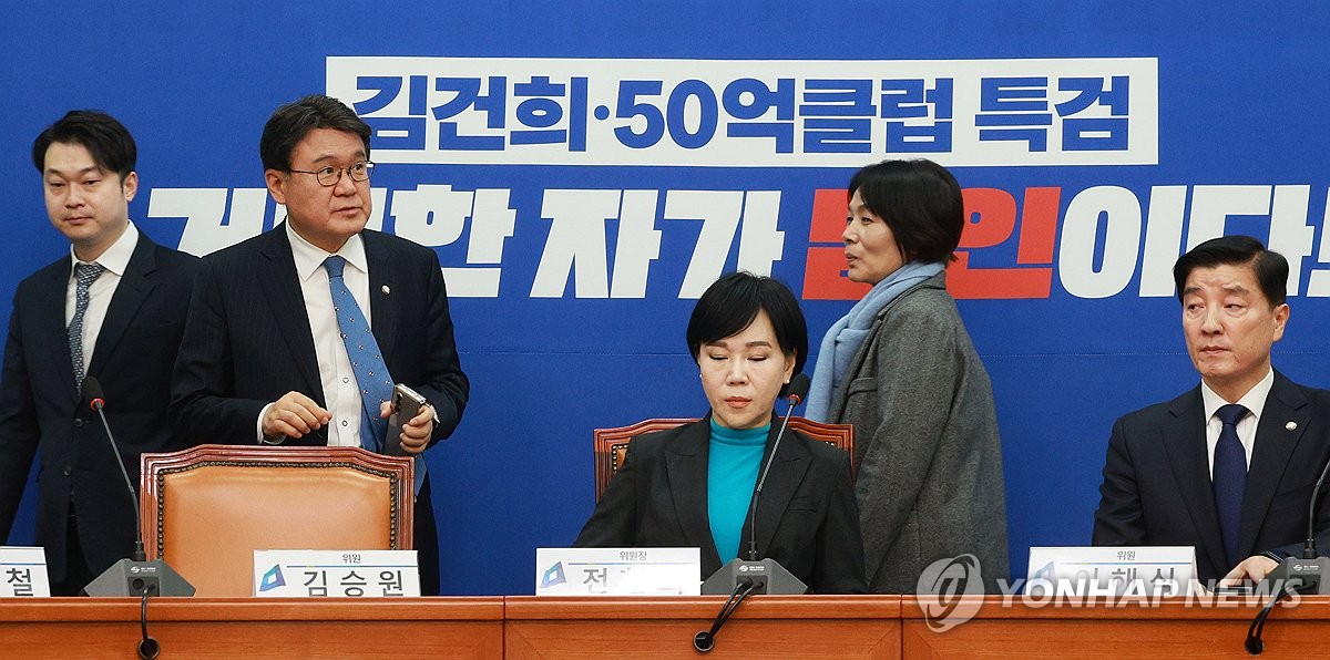 (서울=연합뉴스) 한종찬 기자 = 16일 국회에서 열린 더불어민주당 당대표 정치테러 대책위 4차 회의에서 전현희 위원장과 위원들이 자리에 앉고 있다. 2024.1.16 saba@yna.co.kr