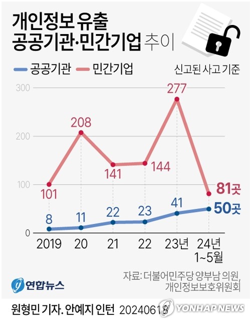 개인정보를 유출한 공공기관은 2019년 8곳에서 2020년 11곳, 2021년 22곳, 2022년 23곳, 2023년 41곳으로 매년 늘었다.