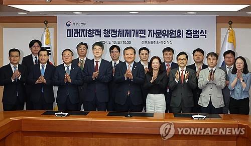 (서울=연합뉴스) 최재구 기자 = 이상민 행정안전부 장관이 13일 종로구 정부서울청사에서 열린 미래지향적 행정체제 개편 자문위원회 출범식에서 참석자들과 기념사진을 촬영하고 있다. 2024.5.13