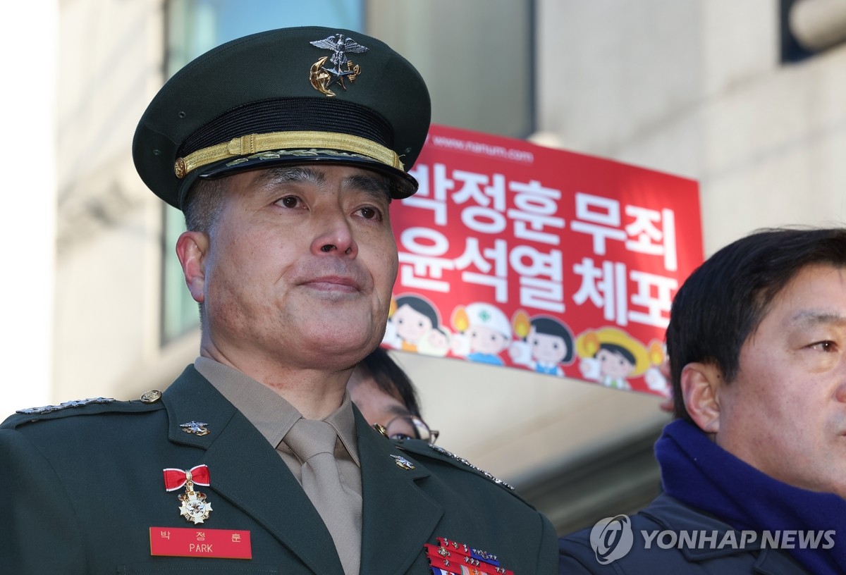 (서울=연합뉴스) 김성민 기자 = 해병대 채모 상병 순직 사건과 관련해 항명과 상관명예훼손 혐의로 기소된 박정훈 전 해병대 수사단장이 9일 오전 서울 용산구 국방부 군사법원 인근에서 1심 선고 공판에 앞서 열린 기자회견에 참석하고 있다. 2025.1.9 ksm7976@yna.co.kr