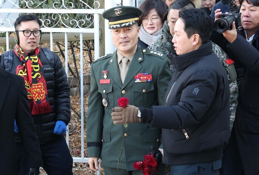 (서울=연합뉴스) 김성민 기자 = 해병대 채모 상병 순직 사건과 관련해 항명과 상관명예훼손 혐의로 기소된 박정훈 전 해병대 수사단장(대령)이 9일 오전 서울 용산구 국방부 군사법원에서 열린 1심 선고 공판을 마치고 나서고 있다. 2025.1.9 ksm7976@yna.co.kr