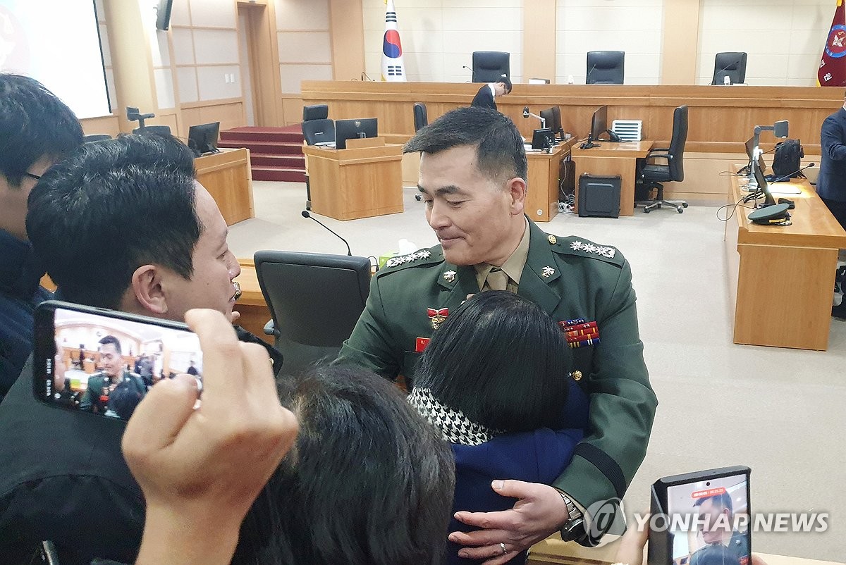 (서울=연합뉴스) 김지헌 기자 = 해병대 채모 상병 순직 사건과 관련해 항명과 상관명예훼손 혐의로 기소된 박정훈 전 해병대 수사단장(대령)이 9일 오전 서울 용산구 국방부 군사법원에서 열린 1심 선고 공판에서 무죄를 선고 받은 뒤 어머니 김봉순씨와 포옹하며 기쁨을 나누고 있다. 2025.1.9 jk@yna.co.kr