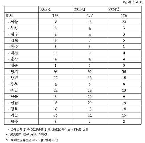 서울은 25곳 중 80.0%인 20곳이, 경기는 46곳 중 78.3%인 36곳이 필수인력 기준 미달이었다. 반면 부산은 16곳 중 18.8%인 3곳만이 기준 미달로 상대적으로 상황이 양호했다.