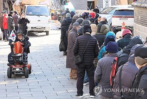 (서울=연합뉴스) 이정훈 기자 = 노인빈곤율이 2년 연속 악화된 것으로 나타난 3일 서울 종로구 탑골공원 원각사 노인무료급식소 앞에 어르신들이 점심식사를 위해 줄지어 서 있다.