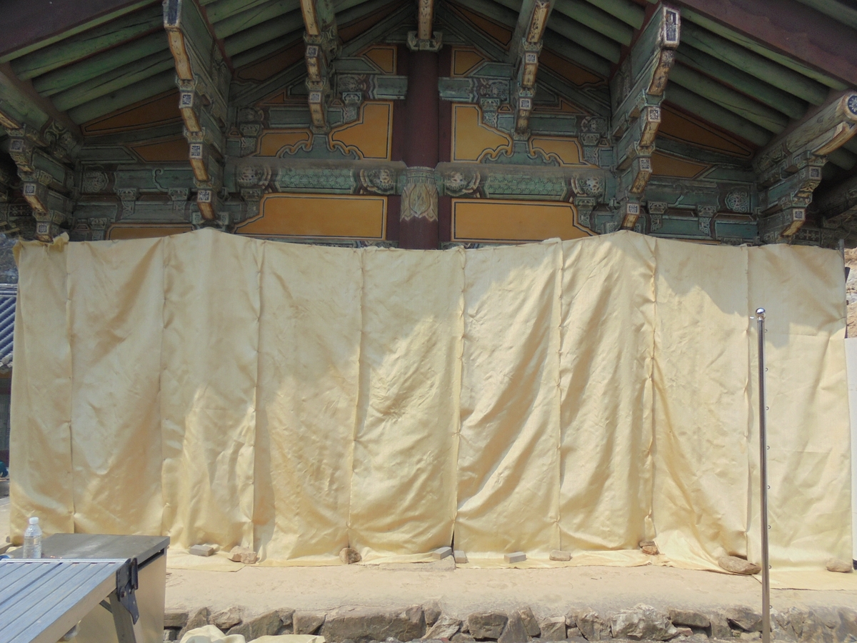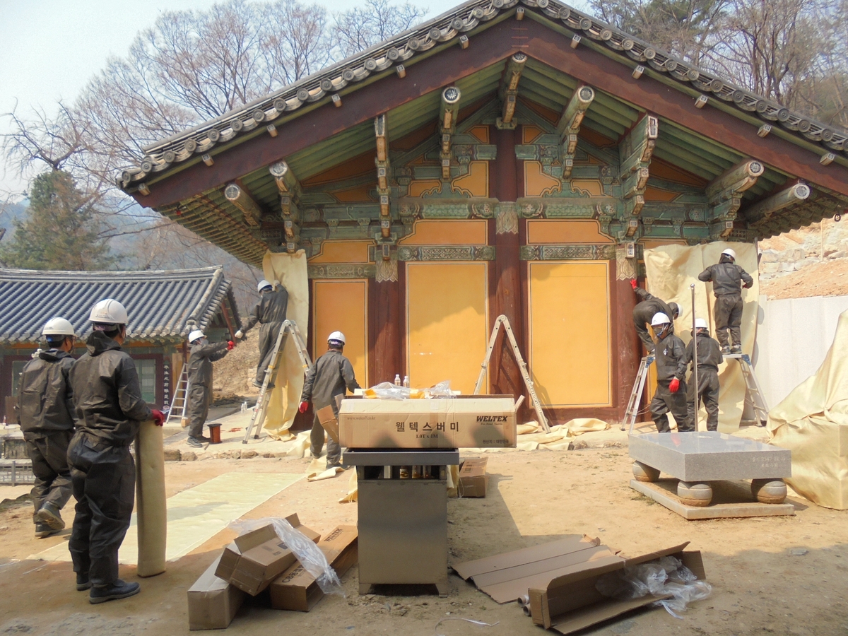 국가유산청은 혹시 모를 상황에 대비해 우리나라에서 가장 오래된 목조 건물로 여겨지는 국보 안동 봉정사 극락전 등 주요 문화유산에 방염포를 설치했다.