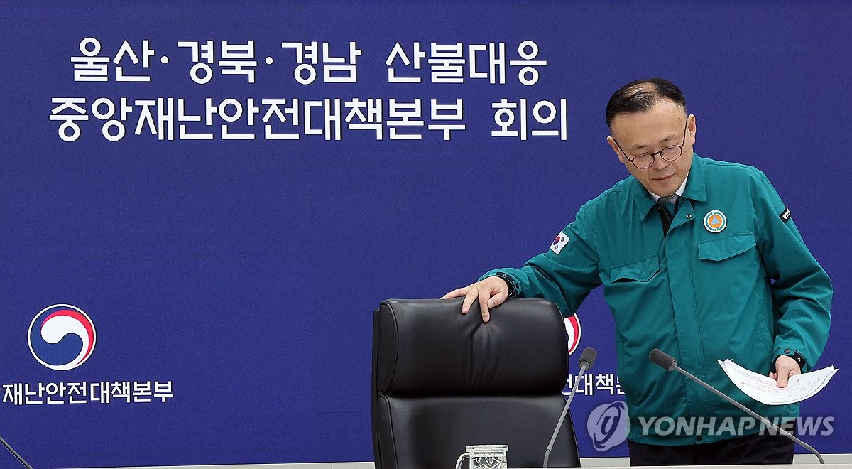 (세종=연합뉴스) 배재만 기자 = 이한경 재난안전관리본부장이 28일 정부세종청사 중앙재난안전상황실에서 열린 울산ㆍ경북ㆍ경남 산불 대응 중앙재난안전대책본부 7차 회의를 주재하기 위해 입장하고 있다. 2025.3.28 scoop@yna.co.kr
