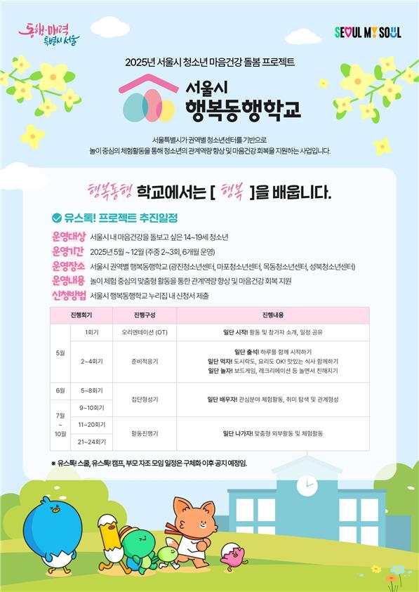 행복동행학교 참가 신청은 오는 3일부터 누리집(www.youthtalk.or.kr)에서 받는다. 자세한 사항은 누리집을 확인하거나 유스톡 사업단(☎ 02-6738-9639)으로 문의하면 된다.