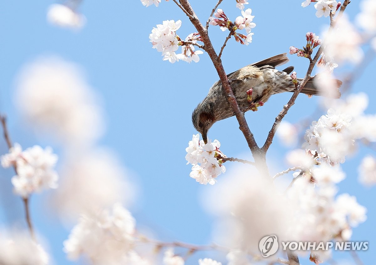 (울산=연합뉴스) 김용태 기자 = 2일 울산시 동구에 활짝 핀 벚꽃 사이에서 직박구리 한 마리가 꿀을 즐기고 있다. 2025.4.2 yongtae@yna.co.kr