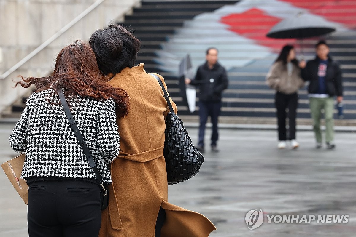 (서울=연합뉴스) 서대연 기자 = 약한 비가 내리며 흐린 날씨를 보인 16일 서울 종로구 광화문 광장에서 시민들이 찬 바람에 몸을 움츠리고 있다. 2025.3.16 dwise@yna.co.kr