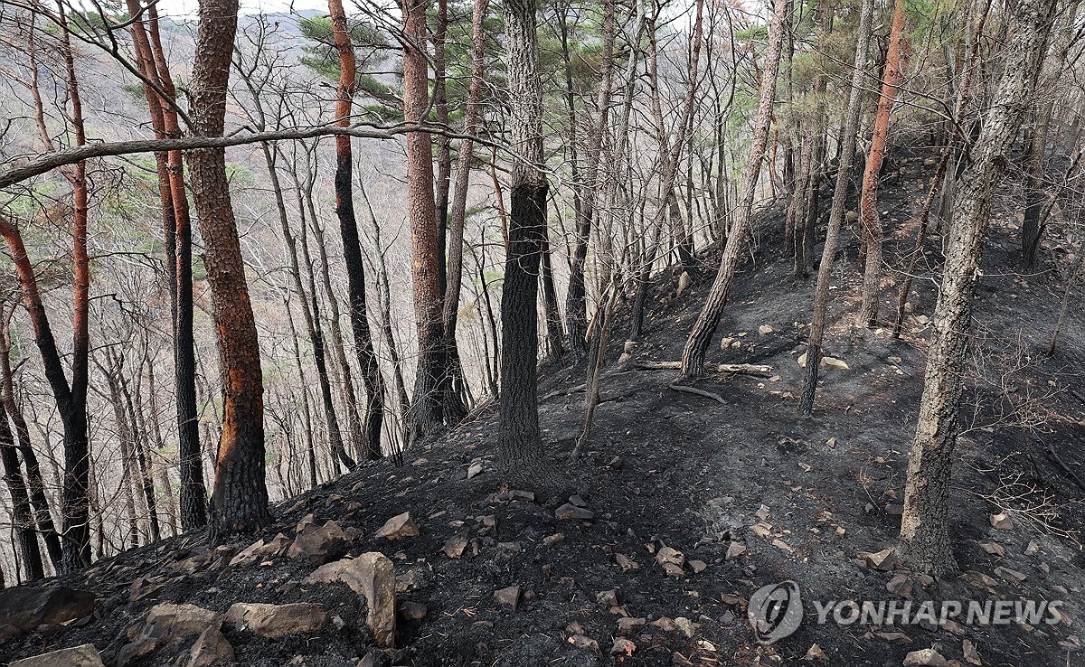(울산=연합뉴스) 김용태 기자 = 울산시 울주군 온양읍 대운산 일대에서 발생한 대형 산불이 엿새 만에 꺼진 가운데 28일 불이 났던 산에 나무들이 검게 타 그을려 있다. 2025.3.28 yongtae@yna.co.kr