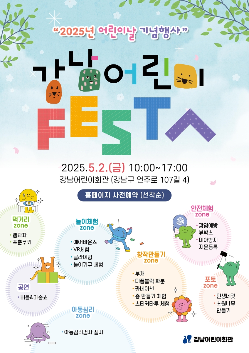 (서울=연합뉴스) 정준영 기자 = 서울 강남구(구청장 조성명)는 어린이날을 맞아 오는 5월 2일 강남어린이회관에서 체험과 놀이 프로그램이 어우러진 '강남어린이 페스타'를 연다고 11일 밝혔다.
