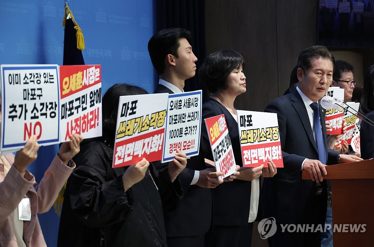 작년 5월 국회에서 마포 쓰레기 소각장 추가 건립 관련 기자회견이 진행되고 있다. [연합뉴스 자료사진]