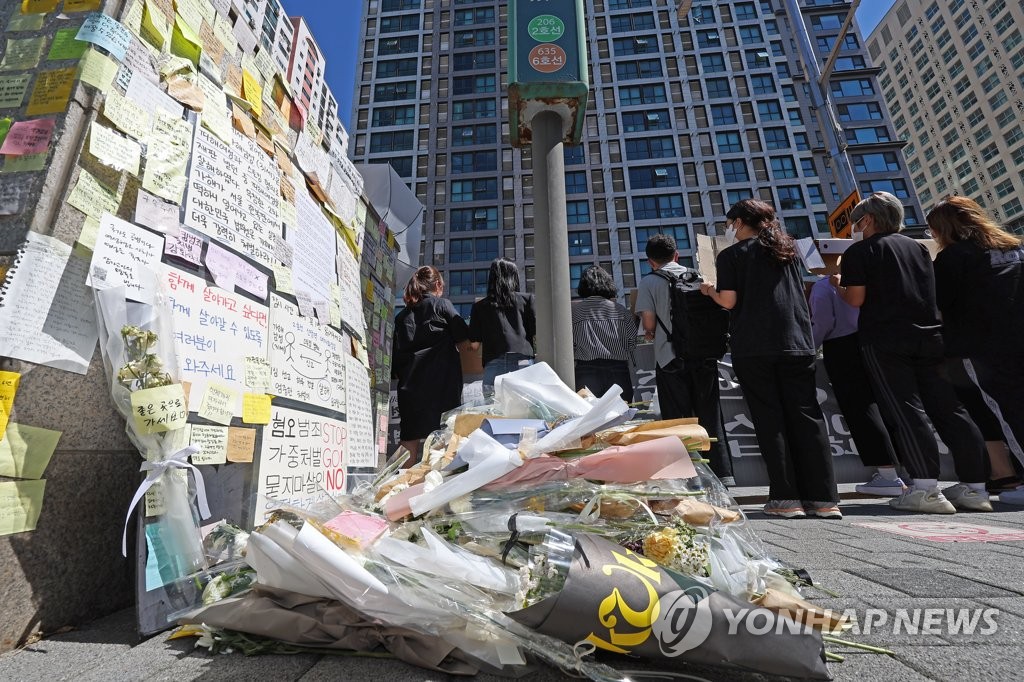 (서울=연합뉴스) 김도훈 기자 = 2022년 9월 19일 서울 중구 신당역 10번 출구 앞에서 열린 스토킹 범죄 피해에 대한 대응책 촉구 기자회견하는 참가자들 뒤로 시민들의 추모 메시지 및 꽃다발이 놓여 있다. [연합뉴스 자료사진] 2025.4.18.