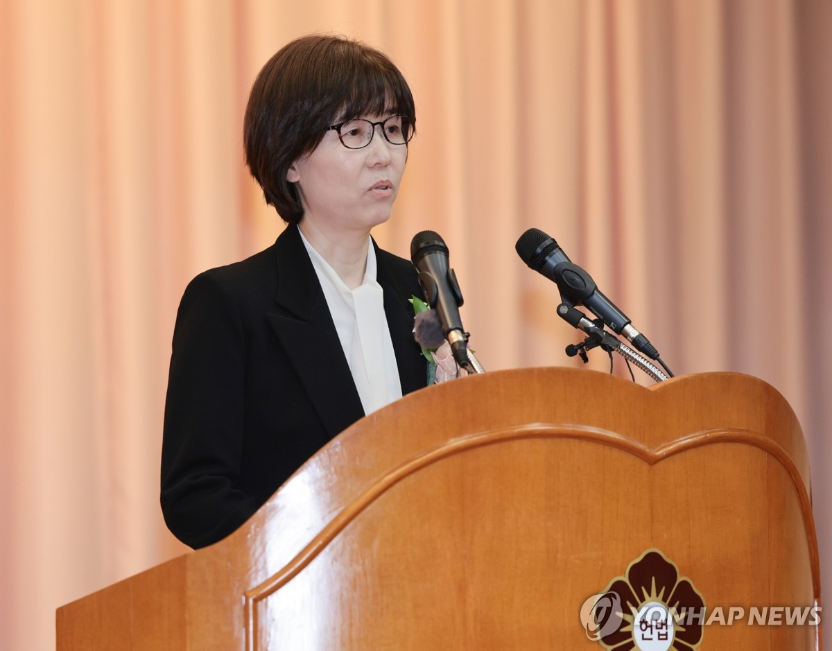 (서울=연합뉴스) 김인철 기자 = 이미선 헌법재판관이 18일 서울 종로구 헌법재판소에서 열린 퇴임식에서 퇴임사를 하고 있다. 2025.4.18 yatoya@yna.co.kr