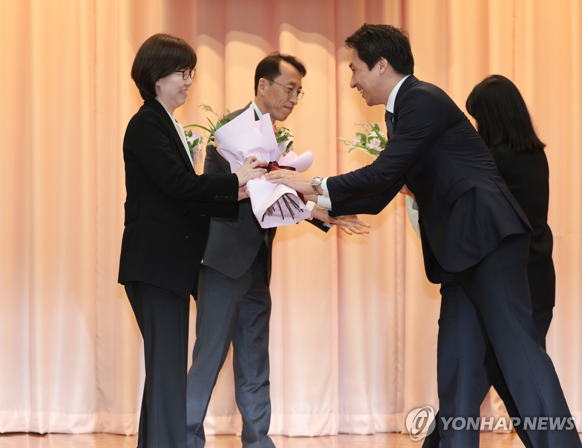 (서울=연합뉴스) 김인철 기자 = 이미선 헌법재판관이 18일 서울 종로구 헌법재판소에서 열린 퇴임식에서 꽃다발을 받고 있다. 오른쪽은 남편 오충진 변호사. 2025.4.18 yatoya@yna.co.kr