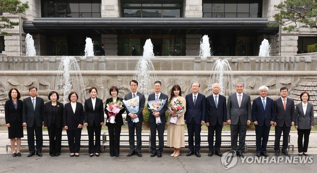 (서울=연합뉴스) 김인철 기자 = 문형배 헌법재판소장 권한대행과 이미선 헌법재판관이 18일 서울 종로구 헌법재판소에서 열린 퇴임식을 마친 뒤 재판관들과 기념촬영을 하고 있다.