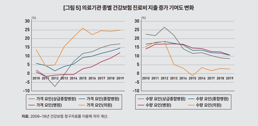 이를 토대로 진료 횟수 증가(수량 요인), 진료 단가 상승(가격 요인), 고령화 등 인구 구조적 변화(인구 요인)로 증가 요인을 분류해 요인별 기여율을 조사했다.