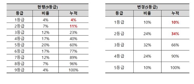 기존 9등급제에서는 상위 4%가 1등급, 그 다음 7%(누적 11%)가 2등급을 받았는데, 5등급제에선 상위 10%가 1등급을 받게 됐다.