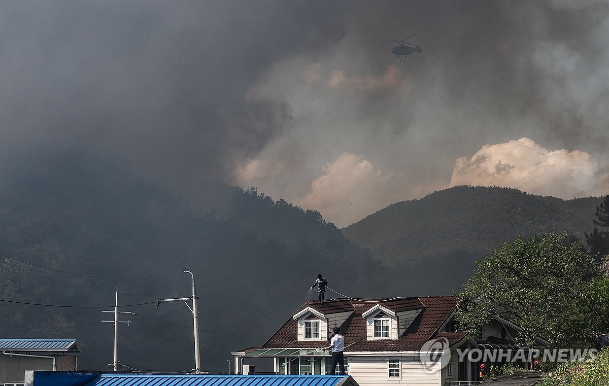 (대구=연합뉴스) 윤관식 기자 = 28일 오후 2시 1분께 대구 북구 노곡동 함지산에서 산불이 발생한 가운데 주민들이 주택 지붕에 물을 뿌리고 있다. 2025.4.28 psik@yna.co.kr