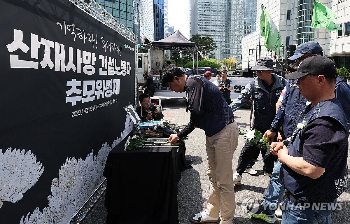(서울=연합뉴스) 서명곤 기자 = 23일 서울 중구 서울고용노동청 앞에서 열린 산재사망 건설노동자 추모 위령제에서 참가자들이 헌화하고 있다. 2025.4.23 seephoto@yna.co.kr