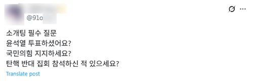'91o***'는 "'윤석열 투표하셨어요? 국민의힘 지지하세요? 탄핵 반대 집회 참석하신 적 있으세요?'가 소개팅 필수 질문"이라고 썼고, 'dre***'는 "소개팅하면 'MBTI' 다음으로 정치 성향에 관해 물어야 한다"고 적었다.