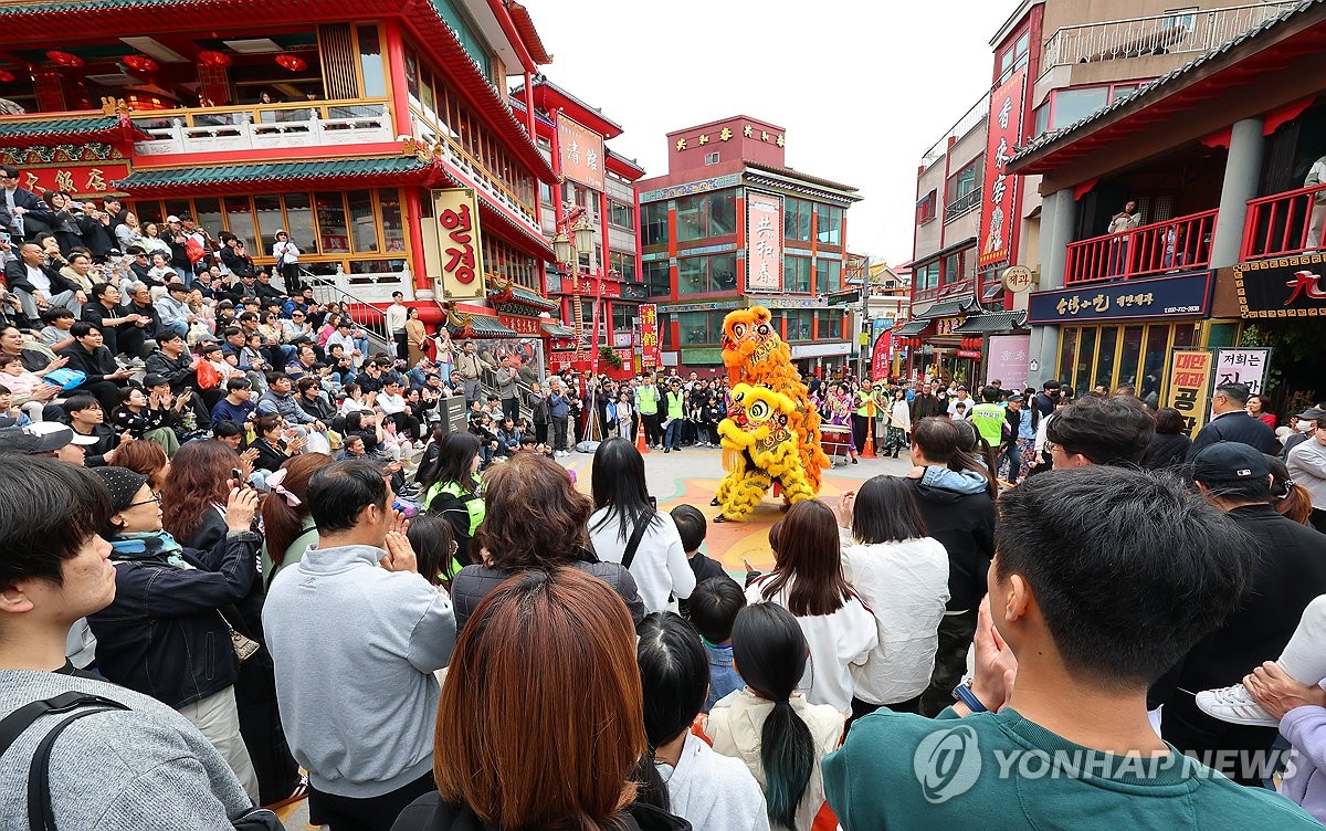 (인천=연합뉴스) 임순석 기자 = 27일 인천 중구 차이나타운을 찾은 나들이객들이 차이나타운 문화공연인 사자춤을 관람하고 있다. 2025.4.27 soonseok02@yna.co.kr