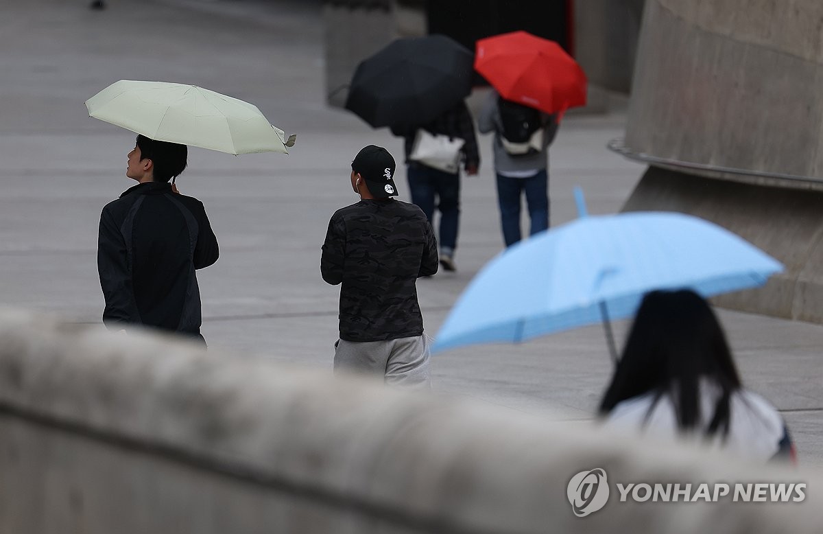 (서울=연합뉴스) 김성민 기자 = 서울에 비가 내린 1일 오전 서울 중구 동대문디자인플라자(DDP)에서 시민들이 비를 피하고 있다. 2025.5.1 ksm7976@yna.co.kr