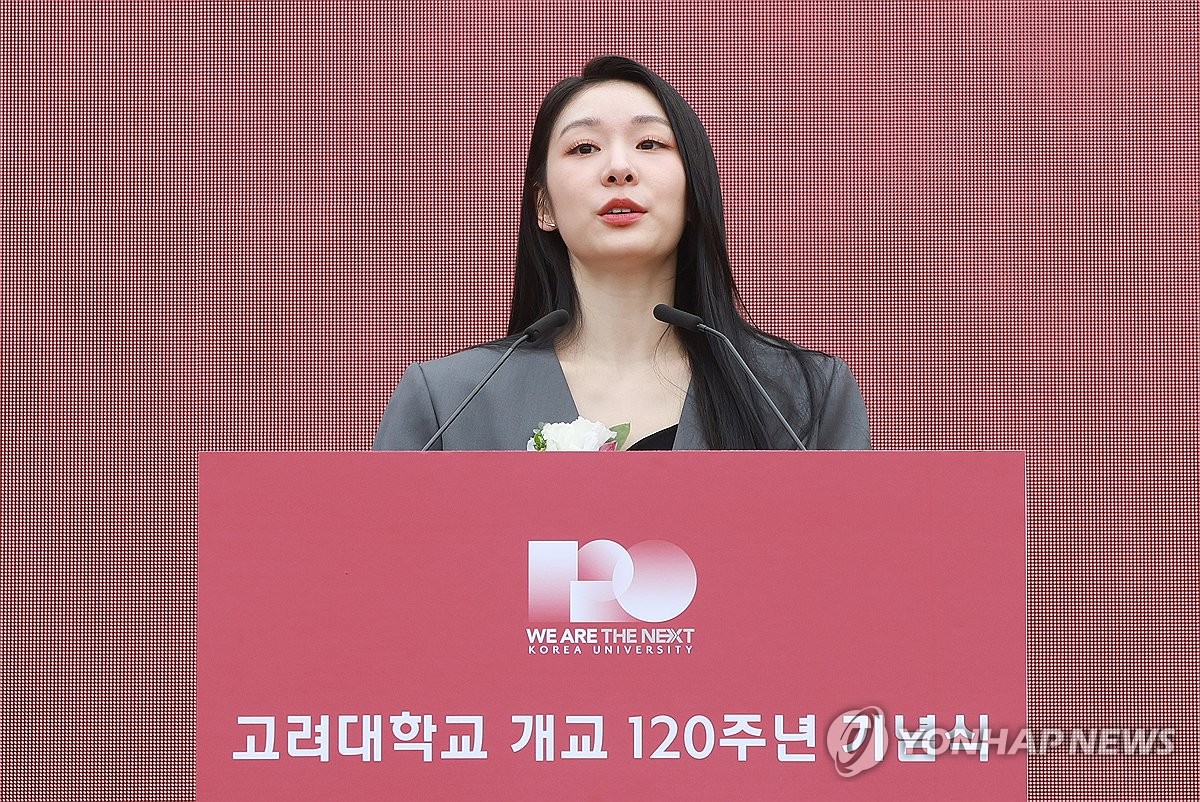 (서울=연합뉴스) 신현우 기자 = 5일 서울 성북구 고려대학교 중앙광장에서 열린 고려대 개교 120주년 기념식에 참석한 전 피겨스케이트 선수 김연아가 축사하고 있다. 2025.5.5 nowwego@yna.co.kr