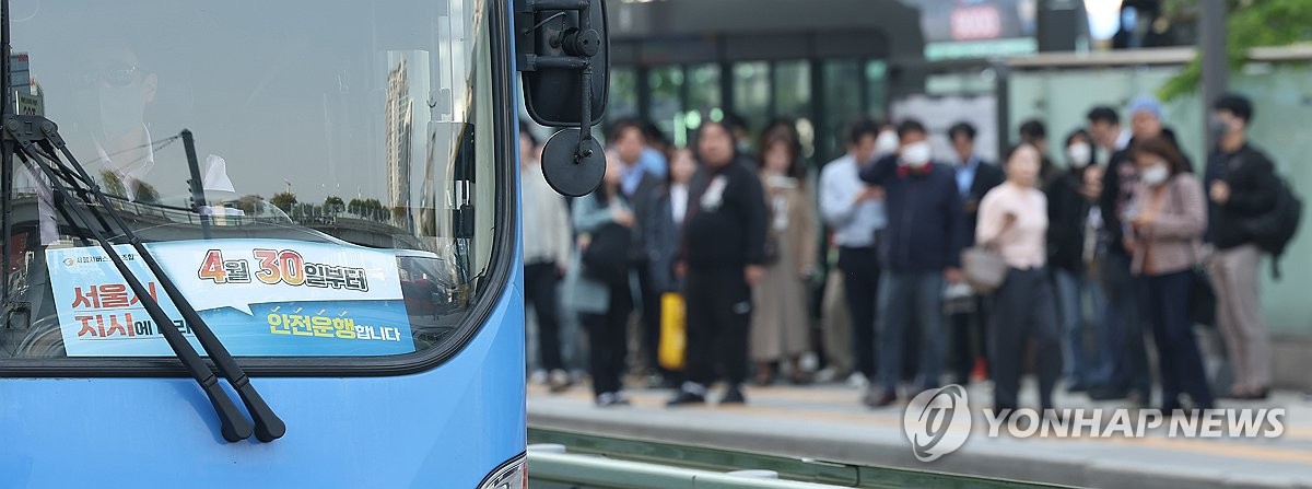 (서울=연합뉴스) 김성민 기자 = 서울 시내버스 노사협상이 결렬되면서 노조가 '준법투쟁'에 돌입한 30일 오전 서울역 앞 버스환승센터의 한 버스에 준법투쟁 안내문이 놓여있다. 2025.4.30 ksm7976@yna.co.kr